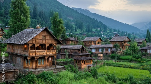 Traditional Kashmiri houses with wooden architecture and intricate designs, set against a lush, green landscape