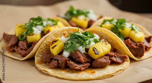Traditional Mexican tacos al pastor with pineapple, onion and cilantro, laid out on parchment paper