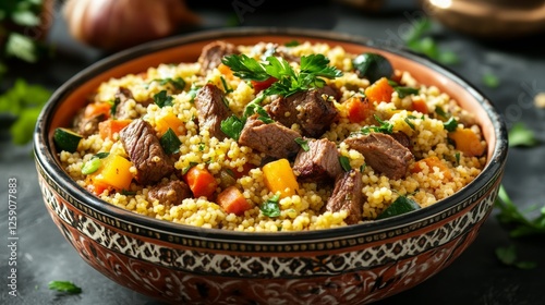 couscous, vegetable, lamb, moroccan, traditional, flavorful, aromatic, dish, rich, ingredient, presentation, food, cultural, theme, detailed, realistic, digital, high, quality, exotic, hearty, closeup, prepared, epicure, meal, fresh, healthy, homemade, savoury, vibrant, dining, cookery, appetising, close-up view, delicious