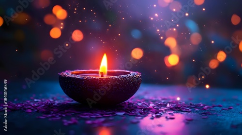 Traditional oil lamp with glowing flame surrounded by colorful bokeh lights and scattered petals creating magical festive atmosphere for celebrations.