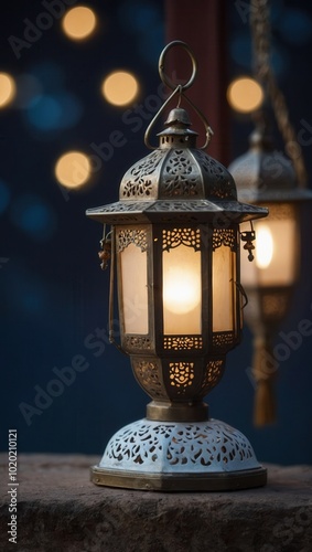 Traditional outdoor lantern illuminated at twilight with a blurred starry sky backdrop
