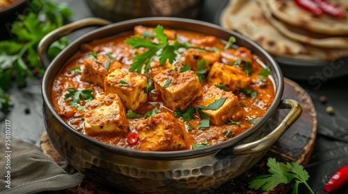 Traditional paneer tikka masala in a brass pot