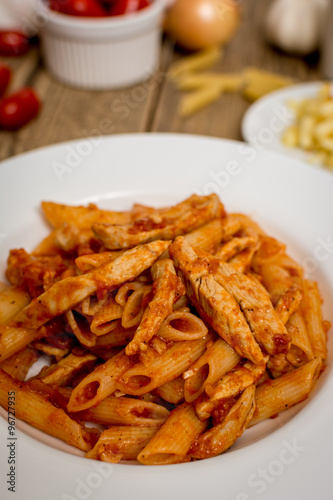 penne, pasta, food, italian, meal, tomatoes, chicken, meat, dinner, sauce, dish, eatery, cheese, fresh, traditional, cookery, herb, bolognese, healthy, plate, delicious, receipe, tube, culinary, vegetable, basil, garlic, tasty, hot, oil, pepper