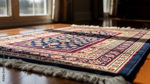 Traditional patterned prayer rug on wood floor ready for worship. Islamic holy day concept. Spiritual devotion for Ramadan.