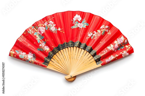 red, chinese, hand, fan, floral, decoration, flower, traditional, culture, asia, china, isolated, white, background, object, accessory, art, design, style, fashion, elegant, summer, cooling, folding, bamboo, wood, paper, japanese