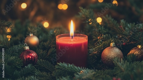 Traditional red Christmas candle burning amid green branches with ornaments. soft light casting cozy glow throughout scene.
