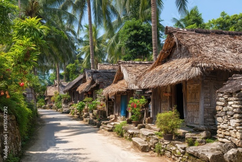Traditional Rural Village With Thatched Roof Houses Surrounded by Lush Palm Trees