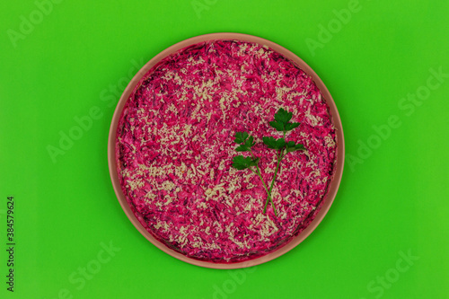 traditional Russian holiday salad Herring under a fur coat (shuba) with sprigs of fresh green parsley on a green background top view