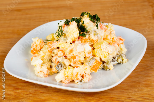 salad, russian, mayo, traditional, food, white, carrot, pea, potato, vegetable, cold, snack, egg, bowl, background, mixed, cookery, plate, sausage, lunch, meal, epicure, closeup, green, refreshment, wooden, new, freshness, dinner, eating, prepared, year, buffet, eatery, parsley, cucumber, christmas, nobody