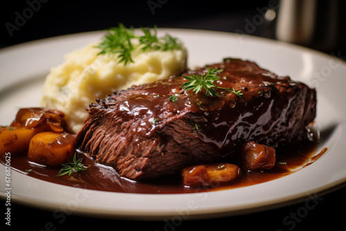 Traditional Sauerbraten with Mashed Potatoes on White Plate
