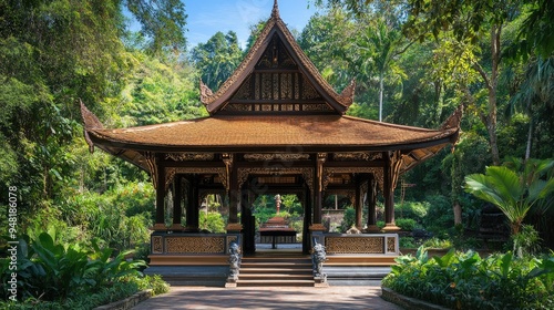 Traditional Southeast Asian pagoda with ornate details, surrounded by lush greenery, cultural charm