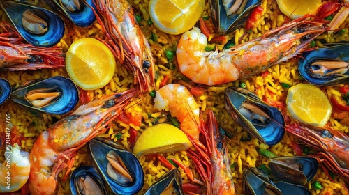 Traditional Spanish paella with seafood and saffron. Featuring a vibrant and aromatic dish. Highlighting the texture and flavors of the paella. Ideal for food and cultural themes.