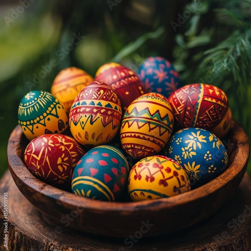 Traditional styled brown wooden basket filled with brightly painted colorful easter eggs resting on natural moss with rustic spring atmosphere background