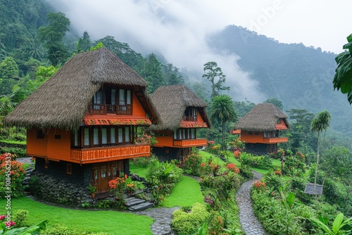 Traditional Thatched Cabins nestled in lush green jungle with misty mountains in the background