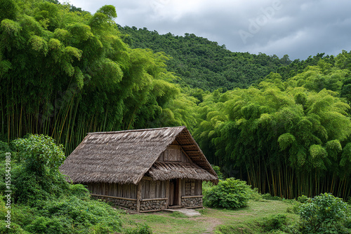Traditional thatched hut surrounded by lush bamboo forest and green hills, rural peaceful dwelling in nature