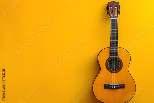Traditional Wooden Acoustic Guitar on Vibrant Yellow Background for Musical Themes