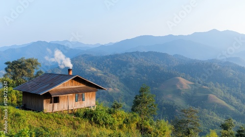 traditional, wooden, house, hilltop, nestled, among, mountain, greenery, countryside, nature, landscape, serene, peaceful, rustic, architecture, smoke, hut, scenery, tranquil, sky, environment, scenic, rural, dwelling, farmhouse, horizon, vale, elevation, remote, sunlight, morning, quiet, view, wood, peak, hillside, charming, idylli
