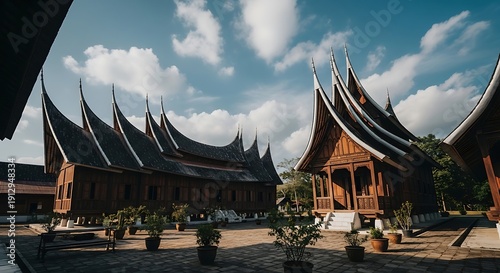 Traditional wooden houses with multiple pointed roofs in courtyard with potted plants under bright cloudy sky