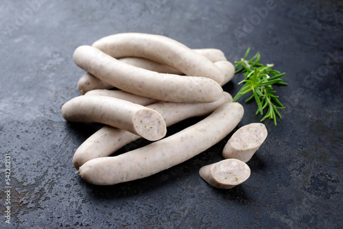 Traditionelle rohe Schweinsbratwurst angeboten als Draufsicht auf einem weißen Board mit Textfreiraum