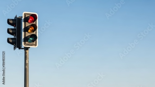 traffic, light, sky, signal, blue, red, yellow, green, clear, stoplight, transportation, urban, city, signal, control, intersection, safety, roadside, equipment, technology, device, infrastructure, regulation, public, warning, signs, stop, wait, go, vertical, street, electricity, metal, sunlight, daylight, empty, isolated, background, environment, stationary, apparatus, contrast, structure