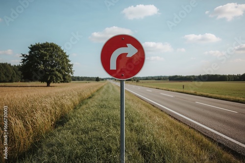 Traffic signs with curved arrows set on a grassy field