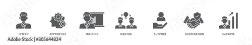 Trainee icon packs for your design digital and printing of intern, apprentice, training, mentor, support, cooperation and improve icon live stroke and easy to edit