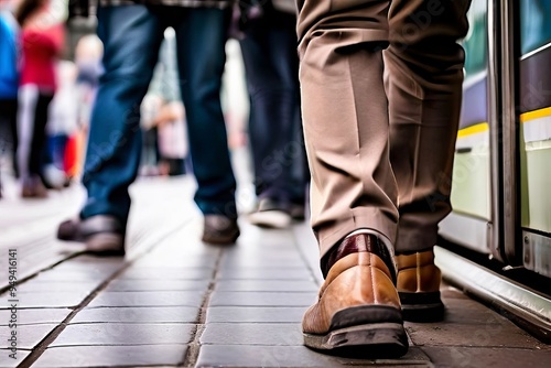 tram stop interaction close up of peoples feet as they step onto