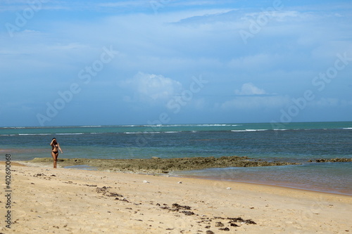 sea, beach, mirror, bahia, rock, sand, ocean, heaven, dunk, summer, blue, coast, vacation, travel, cloud, holiday, landscape, wave, tropical, nature, sun, walk, woman, beautiful, people