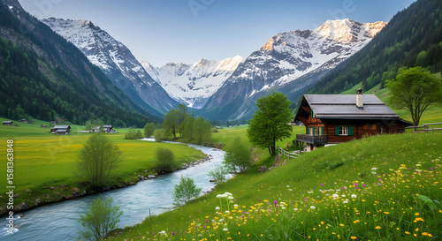 Tranquil Alpine Valley: Snow-Capped Peaks Surrounding a Pristine River Through Green Meadows and a Quaint Chalet
