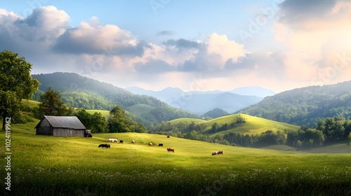 Tranquil and serene watercolor painting of a picturesque rural farmland scene with grazing green hills and a calming natural atmosphere