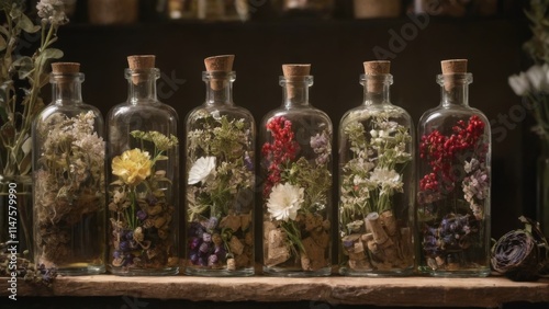 blend, natural, herb, spirit, artisanal, bottle, artistic, label, glasswork, high-quality, purple, white, flower, green, leaf, red, berry, glasses, bottle, cork, wooden, shelf, dried, arranged, orderly, largest, center, side, blurred, room, shelf, decorative, item, peaceful, serene, row, 6