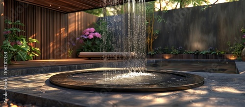 fountain, waterfall, garden, landscaping, nature, duck pond, architecture, design, water, relaxation, backyard, tranquil, serene, asian, zen, stone, tile, flora, greenery, foliage, wildlife, decor, luxury, resort, spa, meditation, flow, splash, plant, rock, natural, interior, exterior, oasis, cascading, paradise, harmony, hideaway, calmness, seclusion, contemplation, rejuvenation, ambience, escape, calming, renewal, soothing