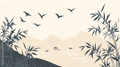 zen, nature, peace, harmony, bamboo, forest, plant, mountain, landscape, scenic, bird, flying, sky, serene, tranquil, calm, soft, light, distance, background, hill, fog, mist, tree, view, artistic, vignetting, simple, design, graphic, travel, tour tourism, pattern, silhouette, shadow, leaf, structure, architecture, art, eastern, asia, oriental, culture, ancient, historical, space, vintage, illustration