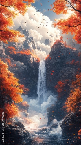 Tranquil Autumn Waterfall in Vibrant Wilderness: Explore Idyllic Nature and Scenic Landscapes