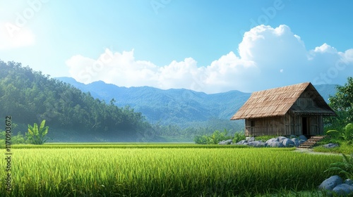 Tranquil Bamboo Hut Amidst Lush Rice Paddy Fields and Mountains