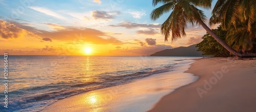 Tranquil beach at sunset with golden and orange hues reflecting on calm waters framed by lush palms in a serene coastal landscape
