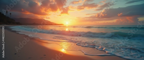 Tranquil Beach at Sunset with Golden Sky and Gentle Waves creating a serene and picturesque seascape