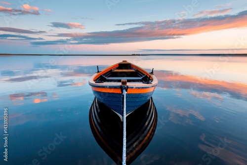 boat, sunset, lake, sky, cloud, tranquil, calm, reflective, water, nature, peaceful, serene, horizon, rowing, solitude, evening, dusk, twilight, scenic, landscape, idylli, orange, blue, silhouette, panorama, nautical, atmospheric, maritime, travel, journey, adventure, relaxation, stillness, symmetry, quiet, moored, tethered, picturesque, still, environment, harbor, pastoral