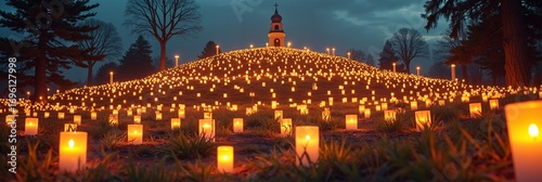 Tranquil candlelit hill with chapel at dusk in serene landscape