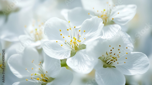 Tranquil close up of white blossoms showcasing their gentle petals and vibrant yellow stamens, evoking sense of peace and beauty in nature
