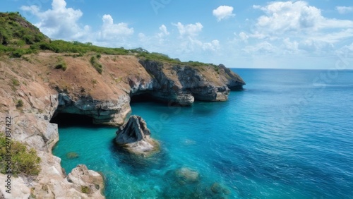Tranquil Coastal Landscape with Turquoise Water, Blue Sky, and Rocky Cliffs with Green Vegetation and Cavelike Formations.