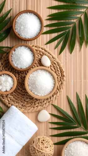 Tranquil flat lay of sea salt on a bamboo mat with warm hues and soft ambiance