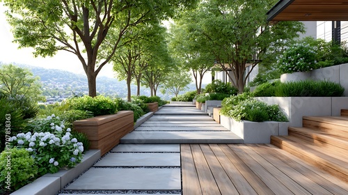 deck, stair, cascade, landscape, pathway, greenery, tree, plant, flower, landscaping, modern, serene, nature, bright, sunlight, peaceful, contemporary, architecture, residential, garden, scenery, idylli, relaxation, view, urban, hill, design, element, aesthetic, earth-tone, space, inviting, tranquil, beauty, soft light, layout
