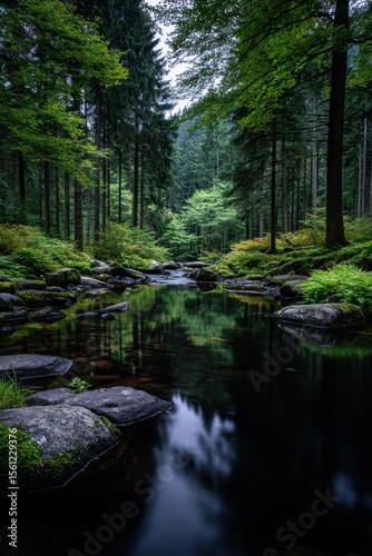 stream, forest, tree, water, rock, moss, calm, nature, green, dark, misty, lush, peaceful, tranquil, quiet, scenic, flowing, beauty
