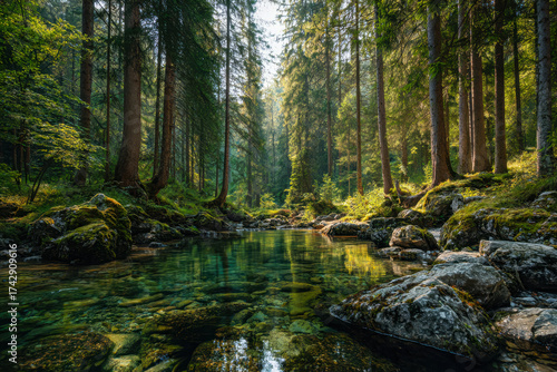 Tranquil forest stream surrounded by lush trees and moss-covered rocks