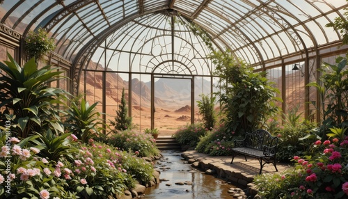Tranquil greenhouse interior seamlessly merges lush greenery with desert landscape panorama