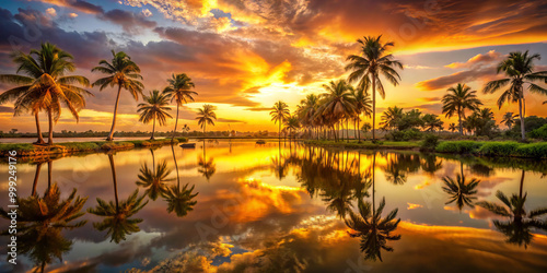 tranquil lagoon reflects stunning golden hour, surrounded by palm trees and vibrant skies. serene atmosphere evokes sense of peace and beauty in nature