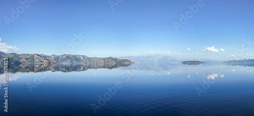 Tranquil Lake Koycegiz panorama under a bright summer sky, with calm waters reflecting the landscape, Mugla, Turkey.