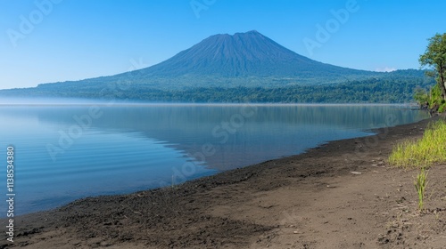 Tranquil Landscape of Lake with Majestic Volcano Under Clear Blue Sky