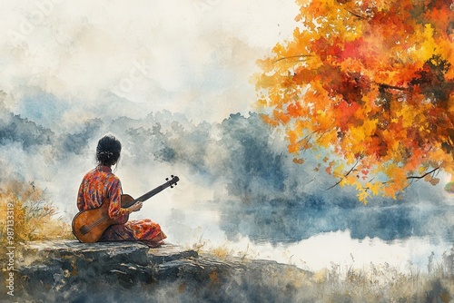 stress, relief, music, therapy, emotional, serene, atmosphere, relaxation, playing, instrument, calm, environment, mindfulness, watercolor, illustration, soothing, melody, tranquil, scene, mental, health, artistic, concept, peaceful, retreat, harmony, technique, healing, process, musical, note, mood, creative, therapeutic, calmness, meditation, practice